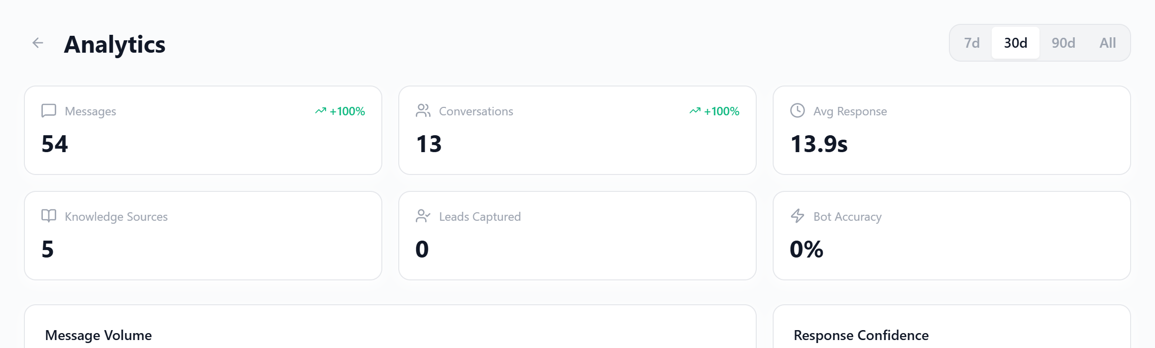 Capture visitor info before conversations. Track volumes, resolution rates, popular topics, and AI confidence scores.