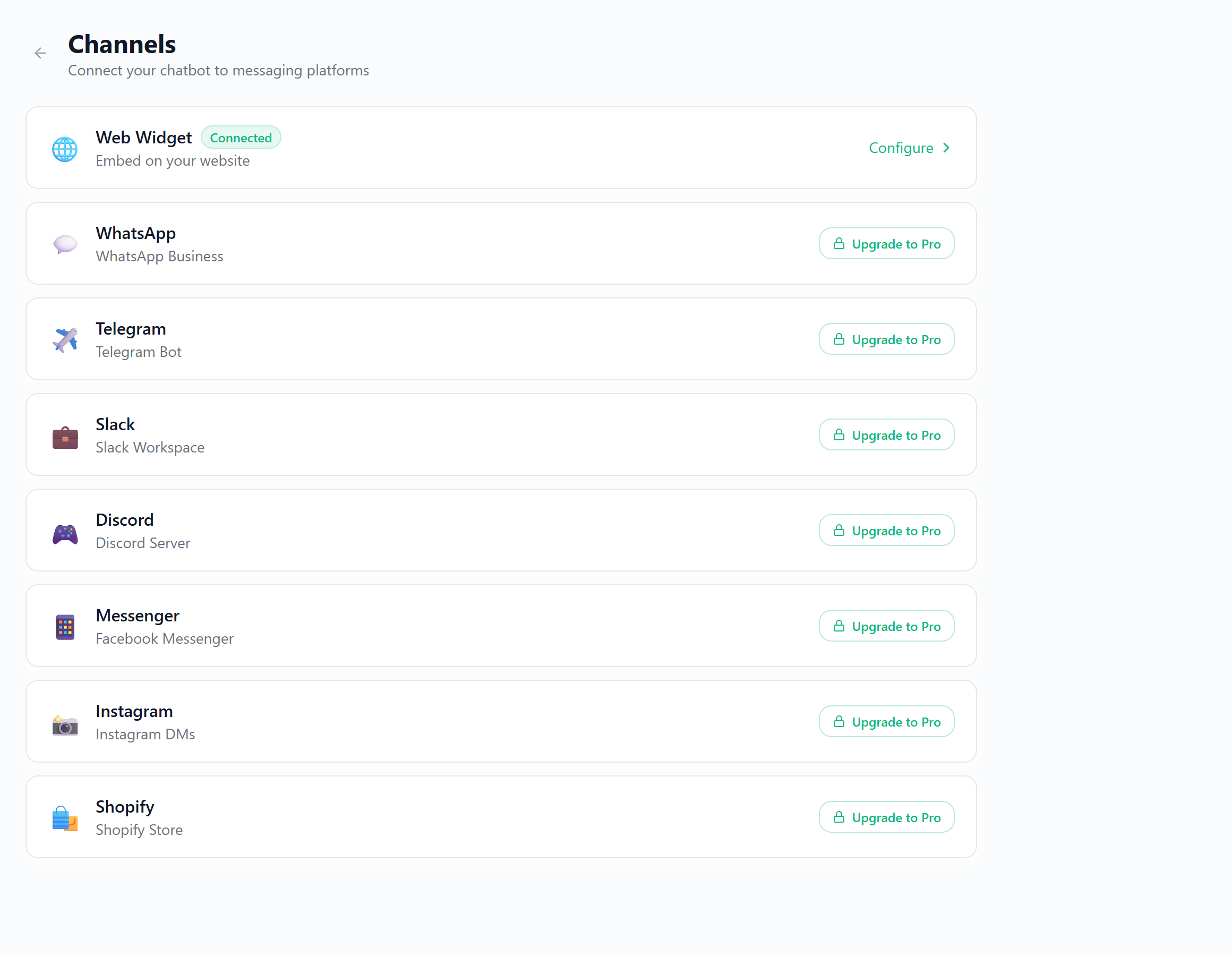 Widget, WhatsApp, Instagram, Messenger, Telegram, Slack, Discord. One knowledge base powers them all.