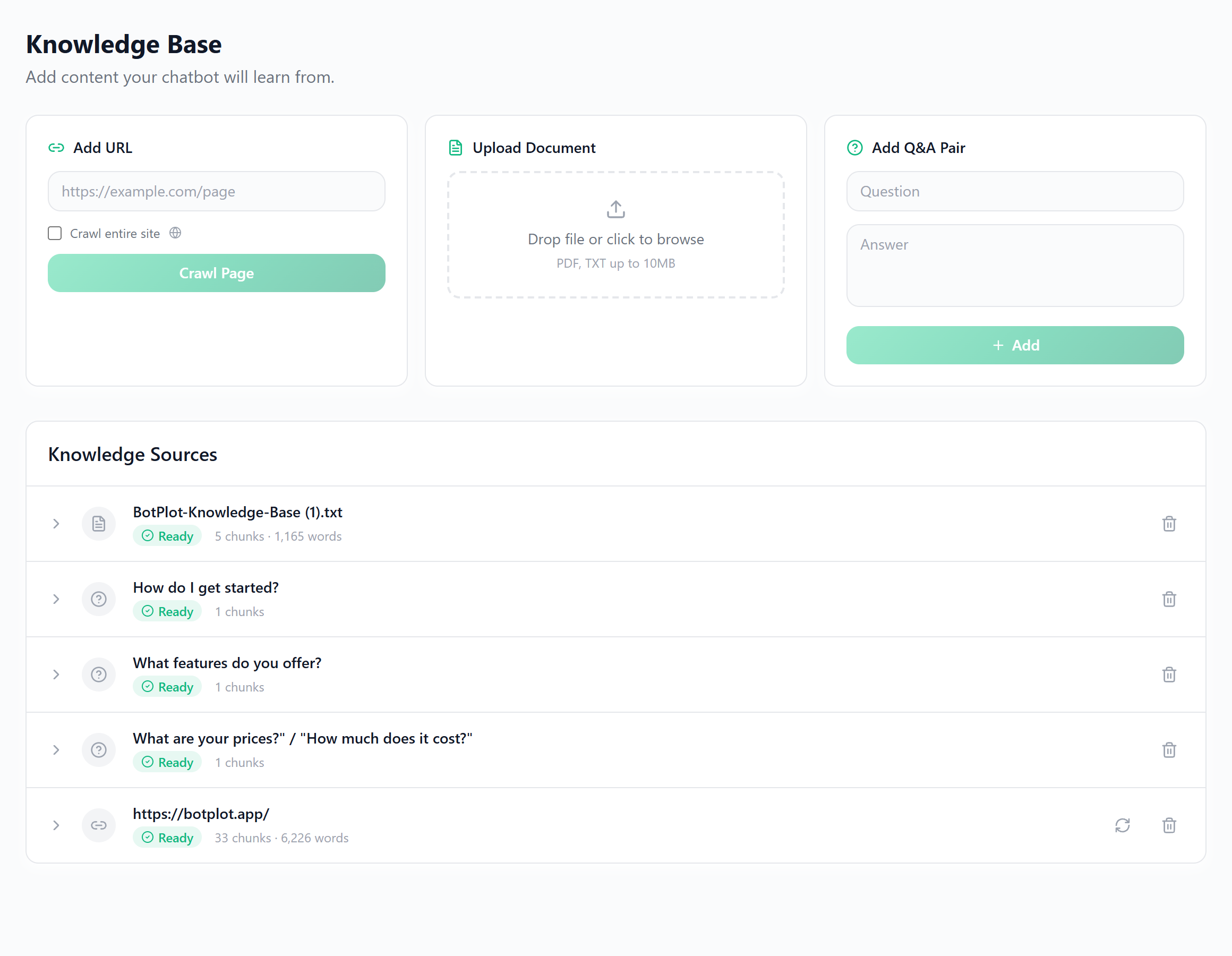 Paste URLs, upload PDFs, or add Q&A pairs. Our crawler handles JS-rendered pages.